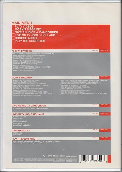 This, the perfect companion piece to the multi-platinum CD Play, highlights Moby as not just an artist and musician, but a personality. Includes 10 music videos for 7 songs, 20 minutes of live footage from "Later with Jools Holland," Moby's 90-minute "Megamix" (the best of the "Play" remixes set to original, incredible visuals) and his hilarious 20-minute home movie "Give an Idiot a Camcorder." Videos: Bodyrock (U.K. auditions), Honey, Find My Baby, Porcelain (U.K. version), Natural Blues, Bodyrock (U.K. version), Run On, Why Does My Heart Feel So Bad, Natural Blues (animated), Porcelain. Live: Natural Blues, Porcelain, Go, New Dawn Fades (If We Can), Machete, Hymn, Everloving, Porcelain (acoustic). DVD-ROM feature: Re-mix 2 Moby songs.
